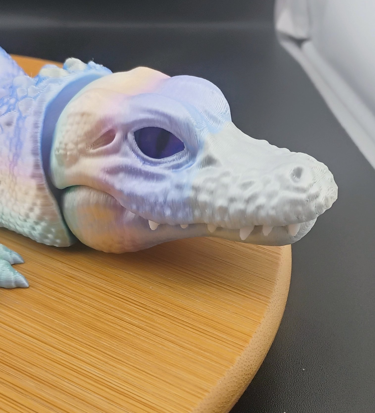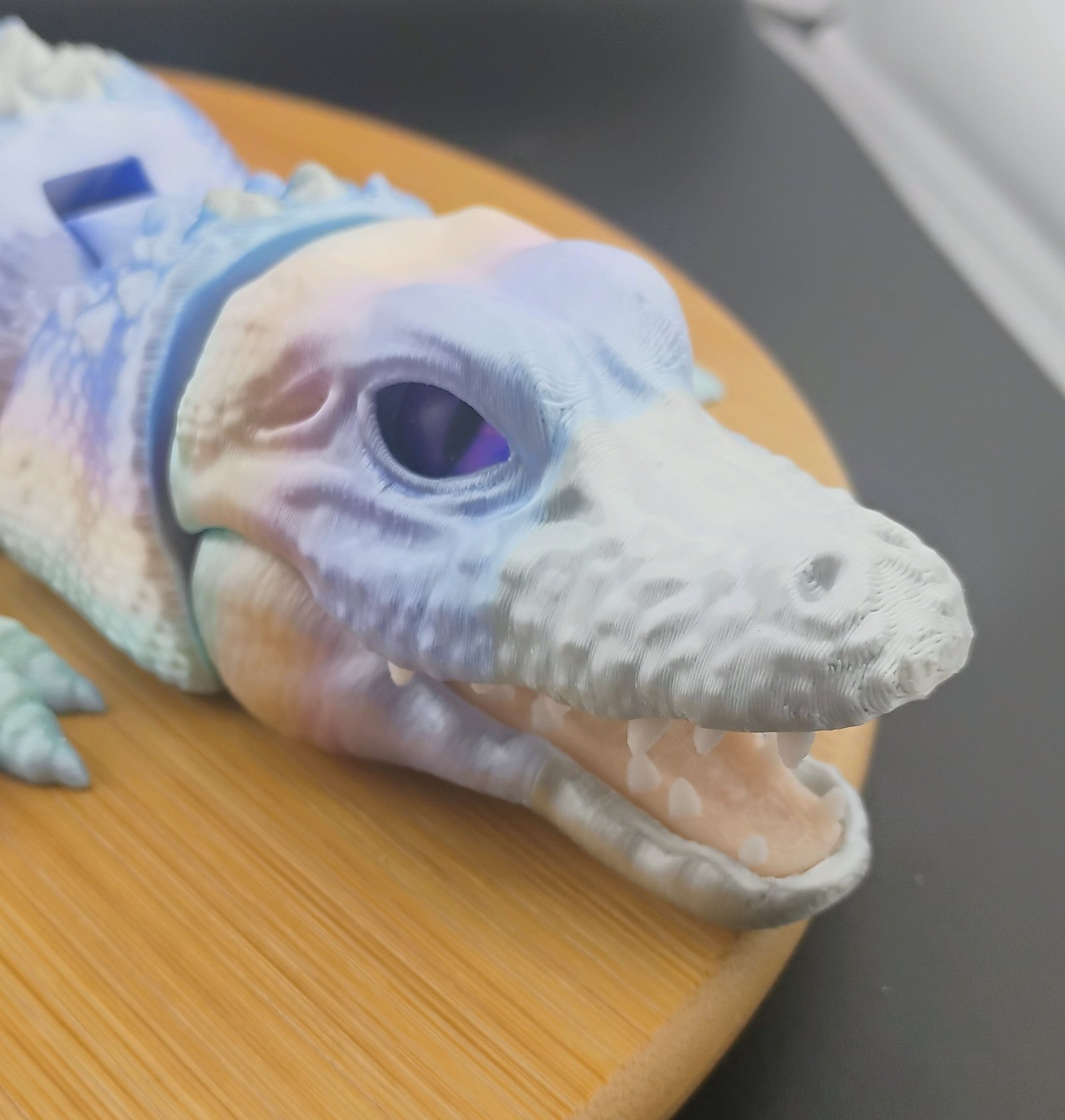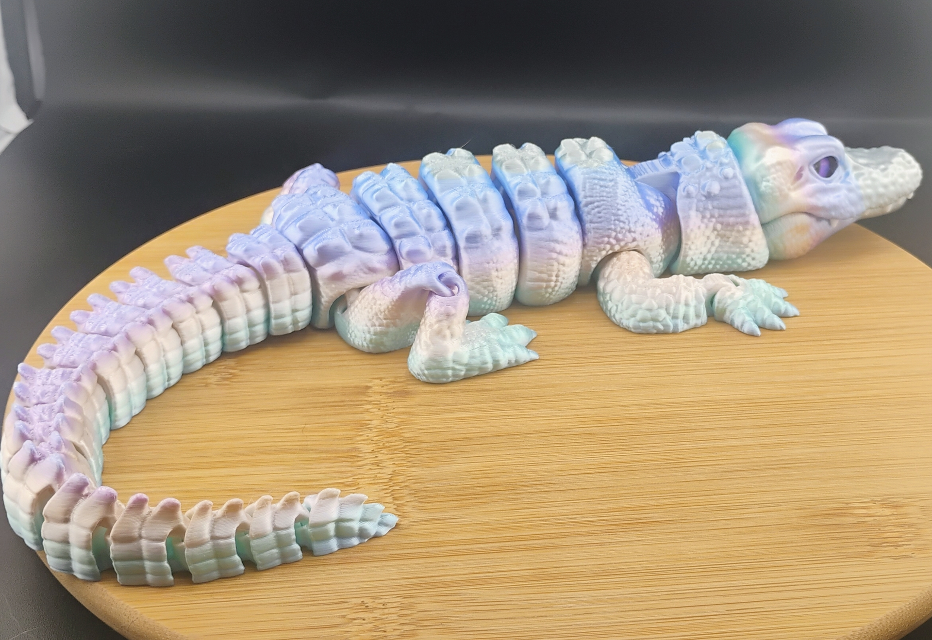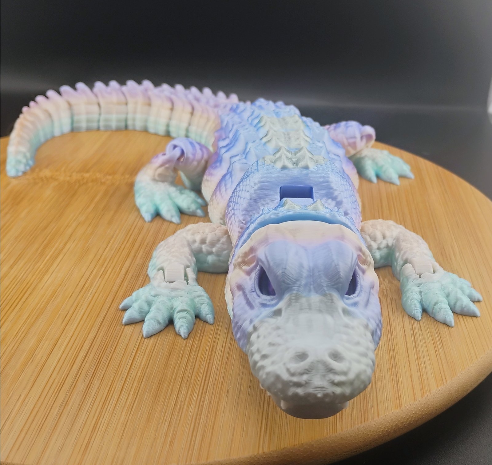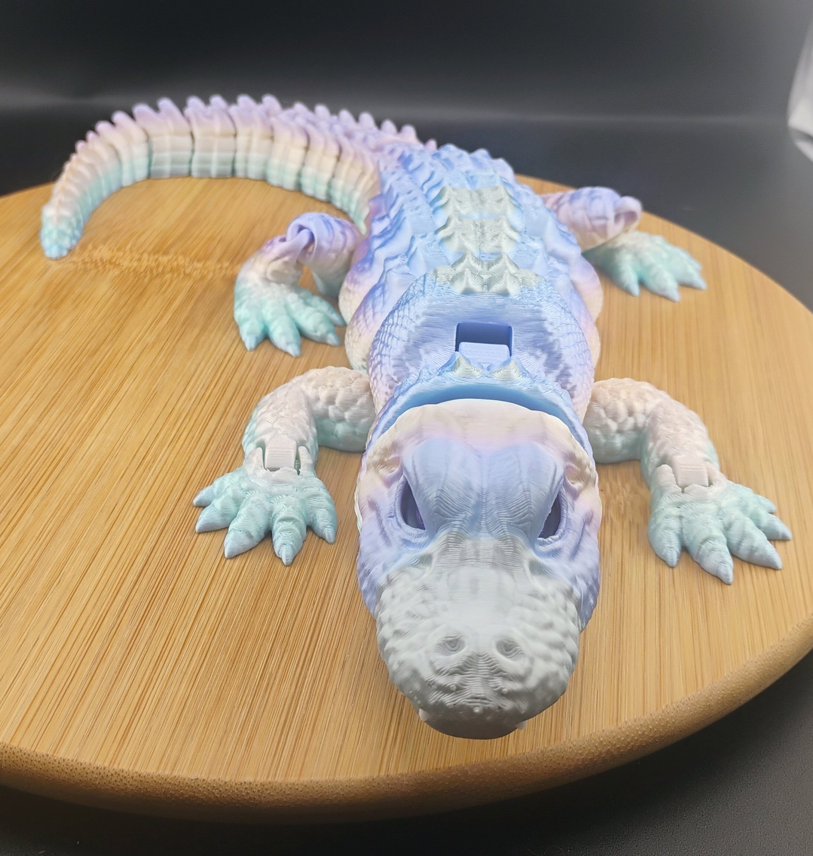 The Aurorascale Flexigator is a stunning 16-inch articulated 3D printed gator featuring a soft aurora-inspired gradient of lavender, teal, icy blue, and pearly white. Printed with 3 perimeter walls and 15% gyroid infill for durability and smooth articulation.