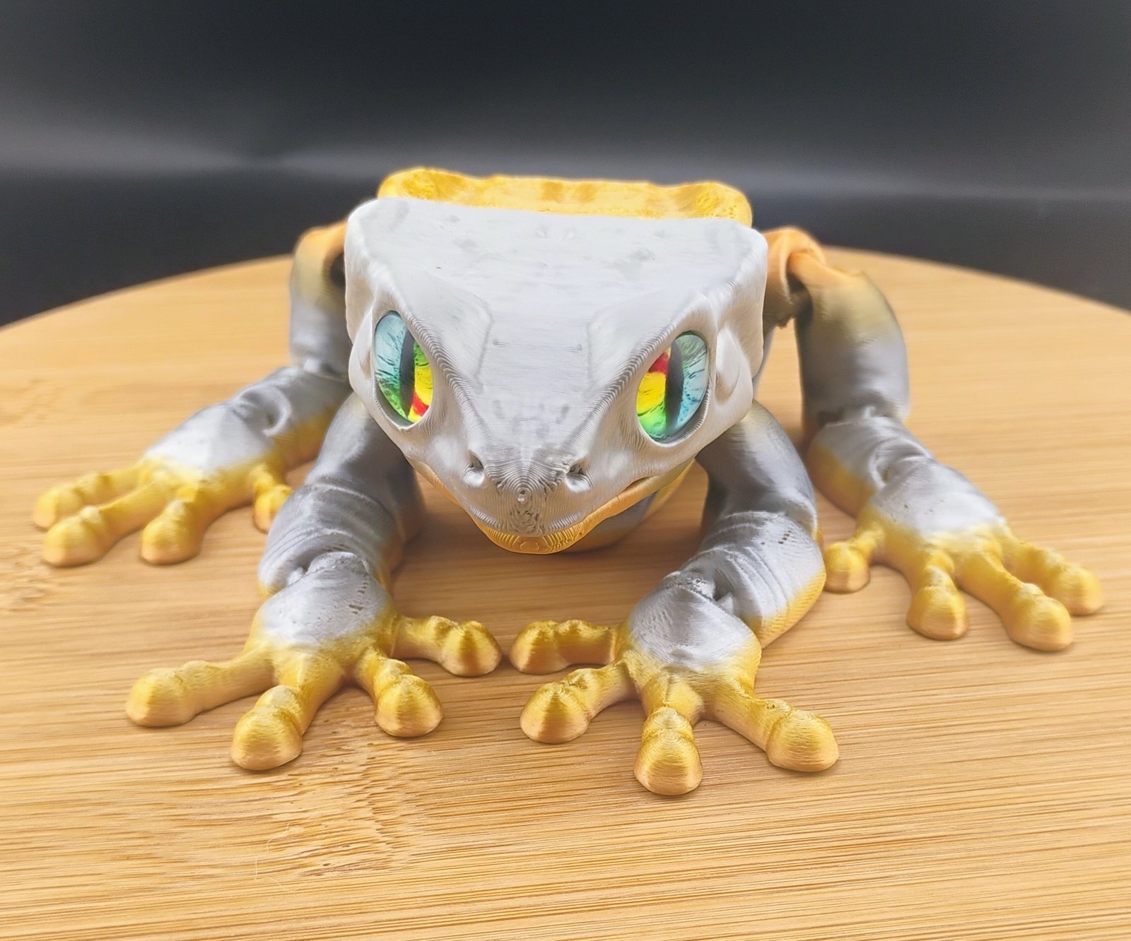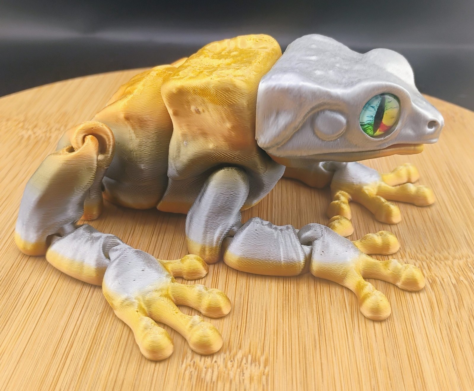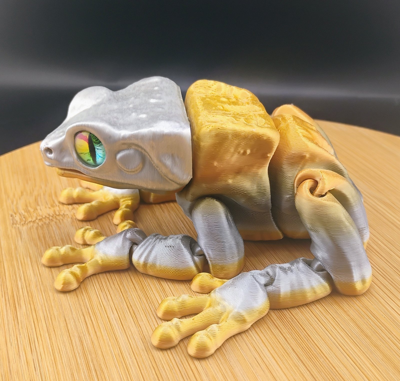 The Chroma Frog is a sleek articulated 3D printed frog with a metallic silver-to-gold gradient and vibrant prism eyes. Printed with 3 perimeter walls and 15% gyroid infill for strength, durability, and smooth articulated posing.
