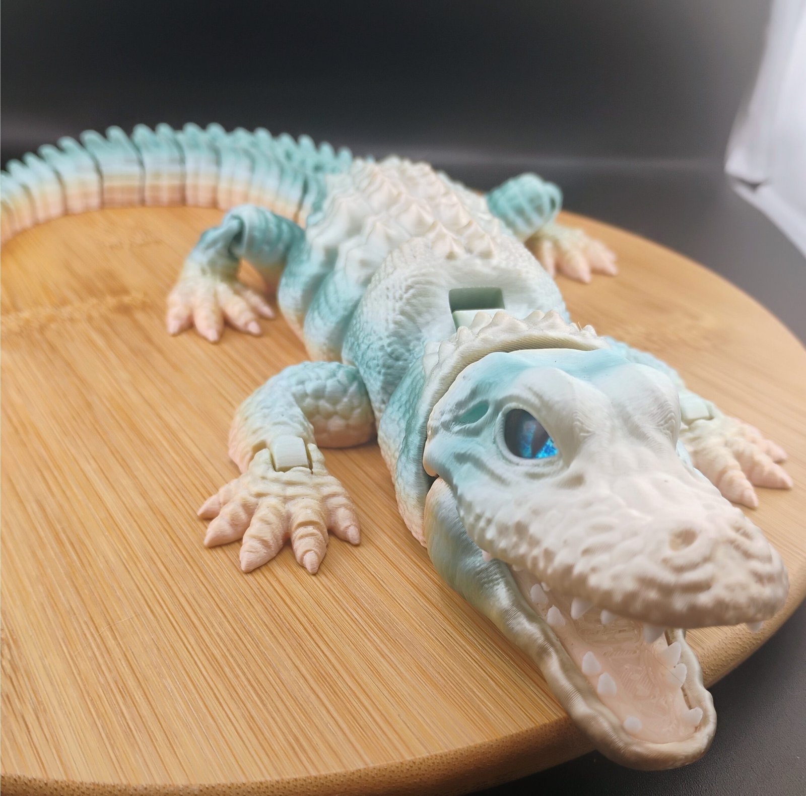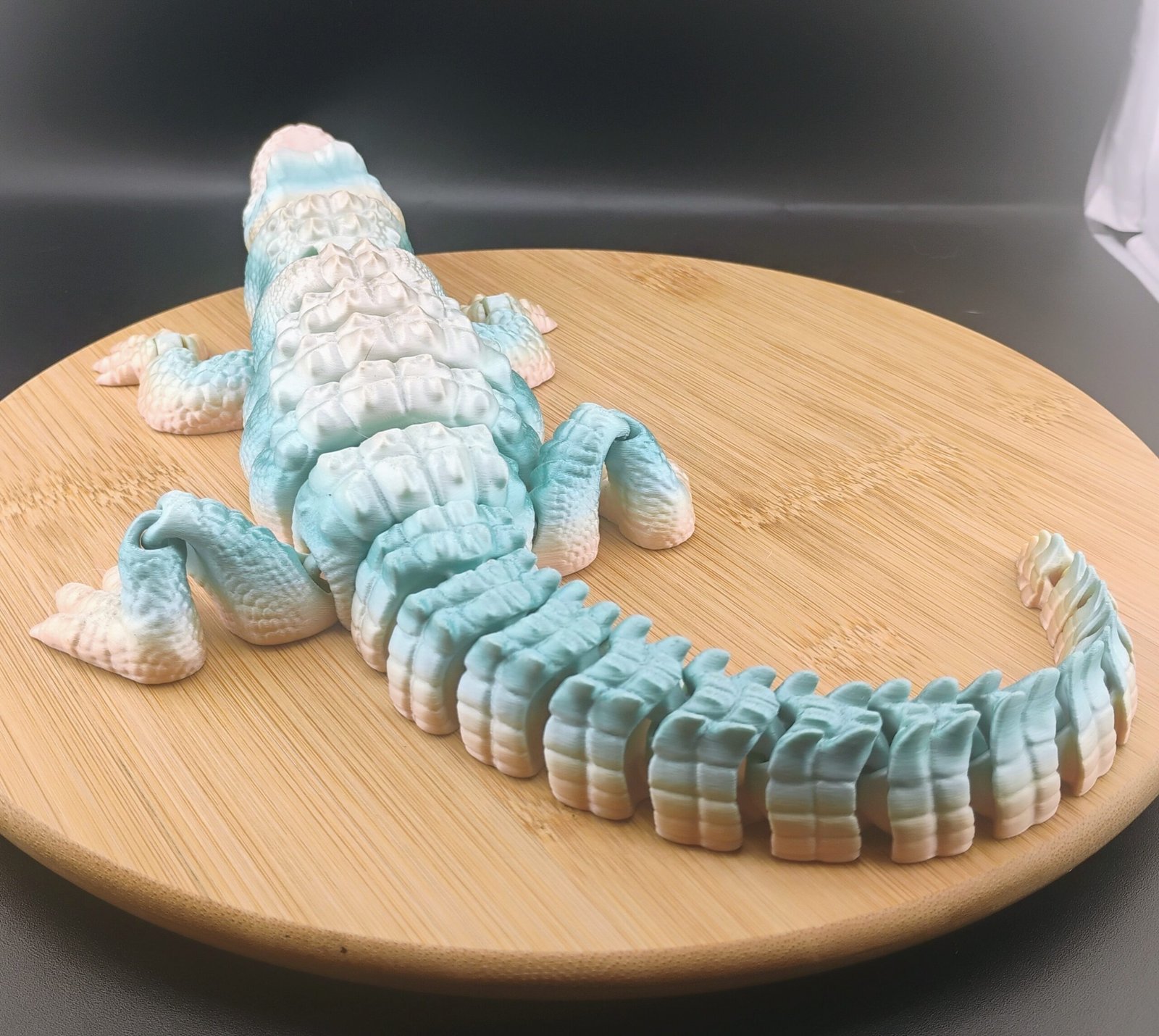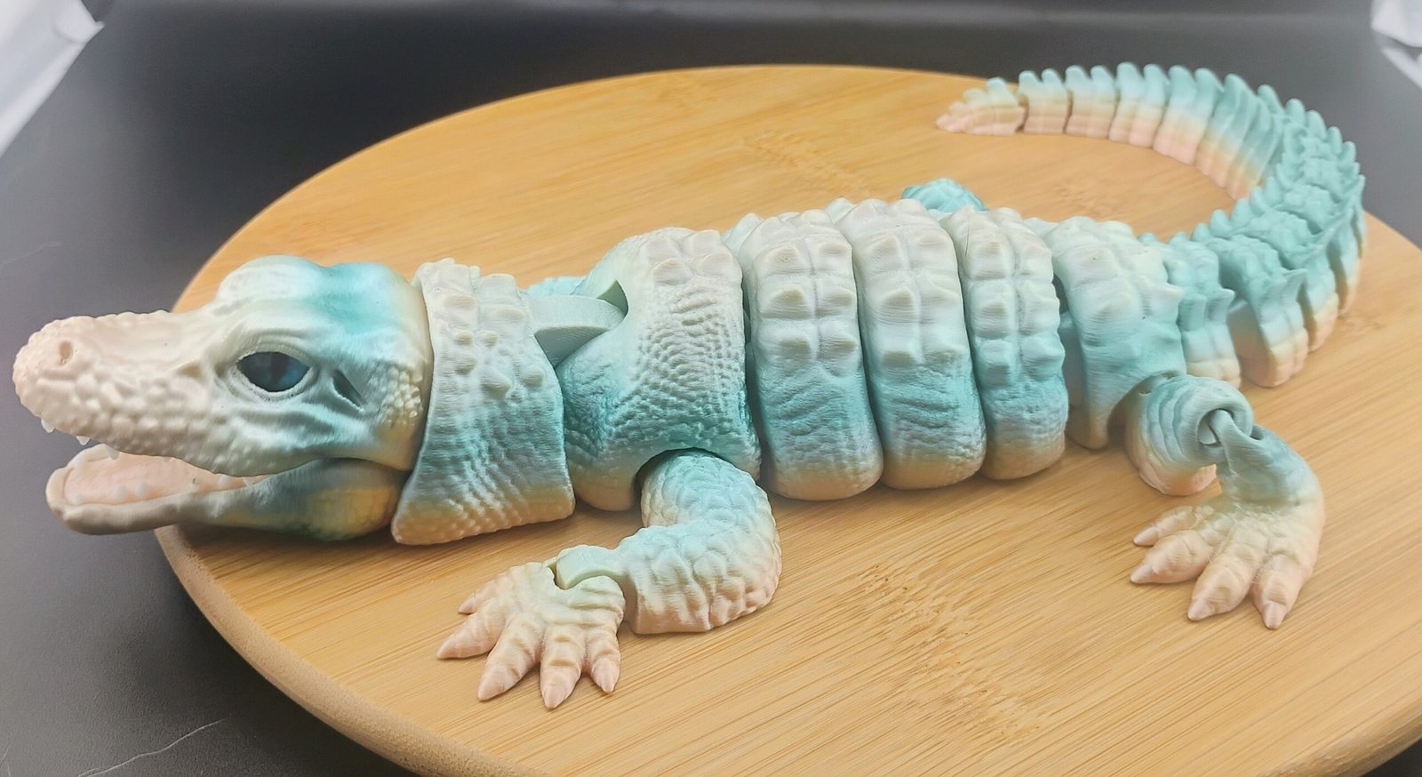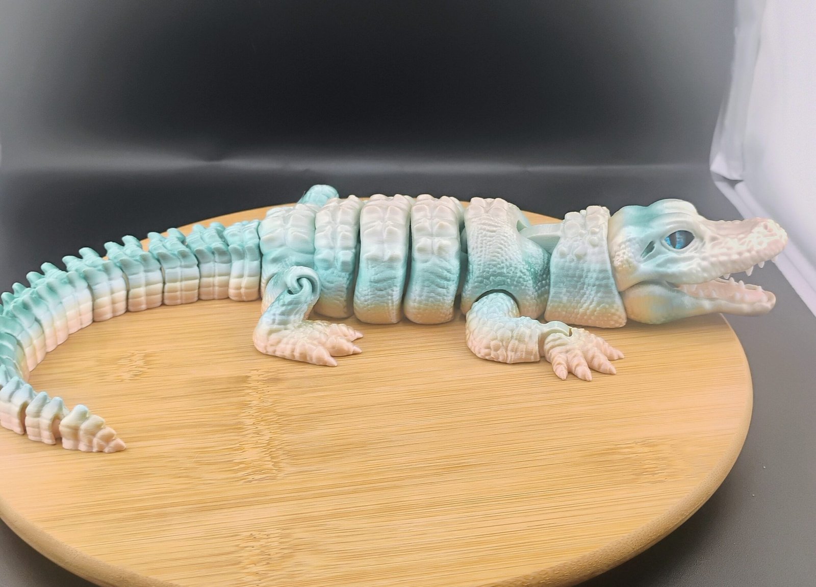 Meet the Mistscale Flexigator, a serene-yet-striking 16-inch articulated 3D printed gator washed in cool aquas, soft mint tones, and creamy warm highlights. This gentle beauty looks like it rose from dawn-lit mist, carrying the calm, airy elegance of early morning waters.