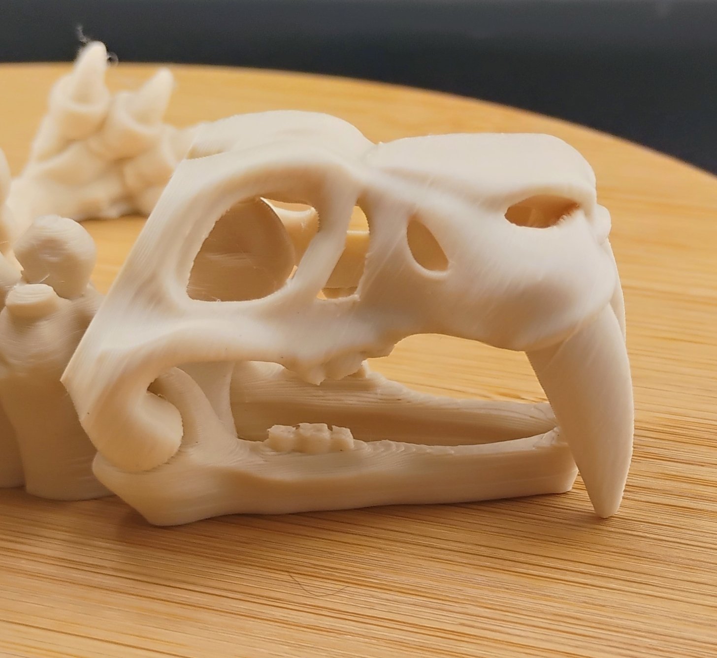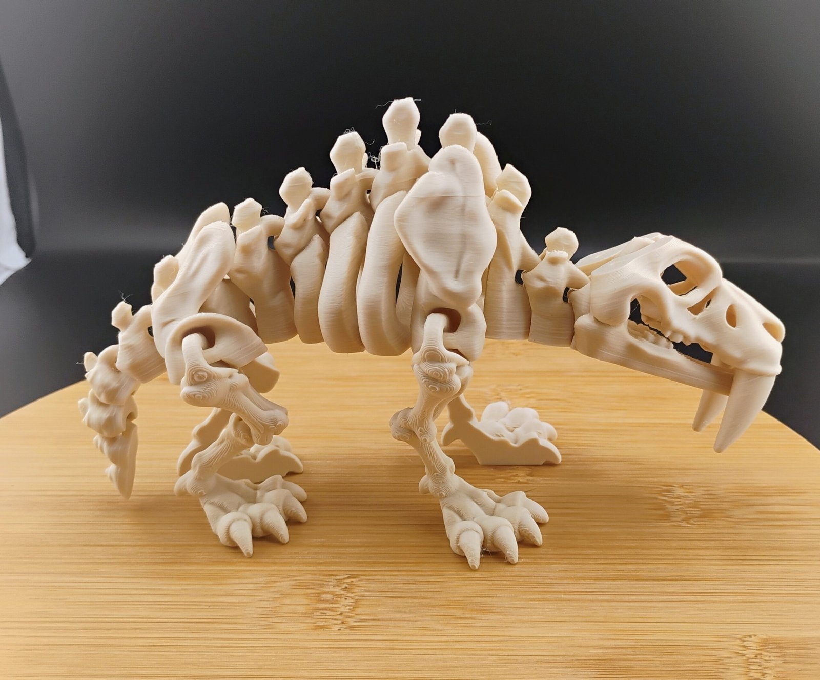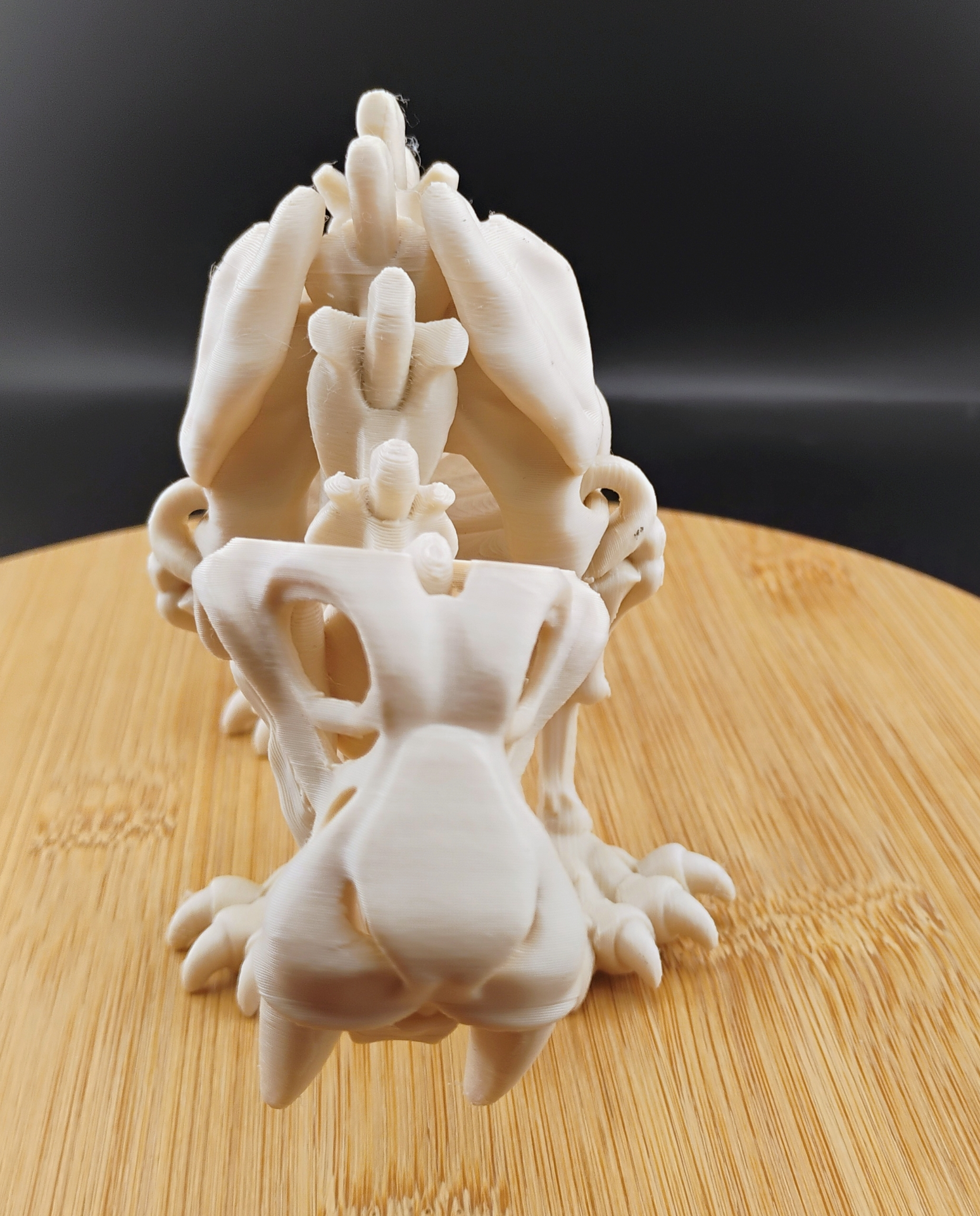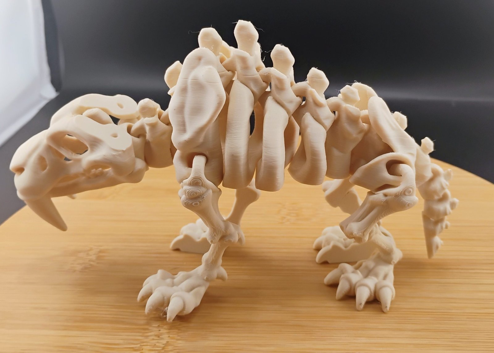 Printed in a creamy, bone-pale gradient filament, this skeletal hunter looks like it clawed its way straight out of a frost-kissed cave painting. With massive saber fangs, chunky articulated paws, and a snarling skull full of attitude, Pale Pouncer is equal parts adorable and intimidating — the perfect desk guardian for anyone who loves prehistoric beasts with a spooky twist.