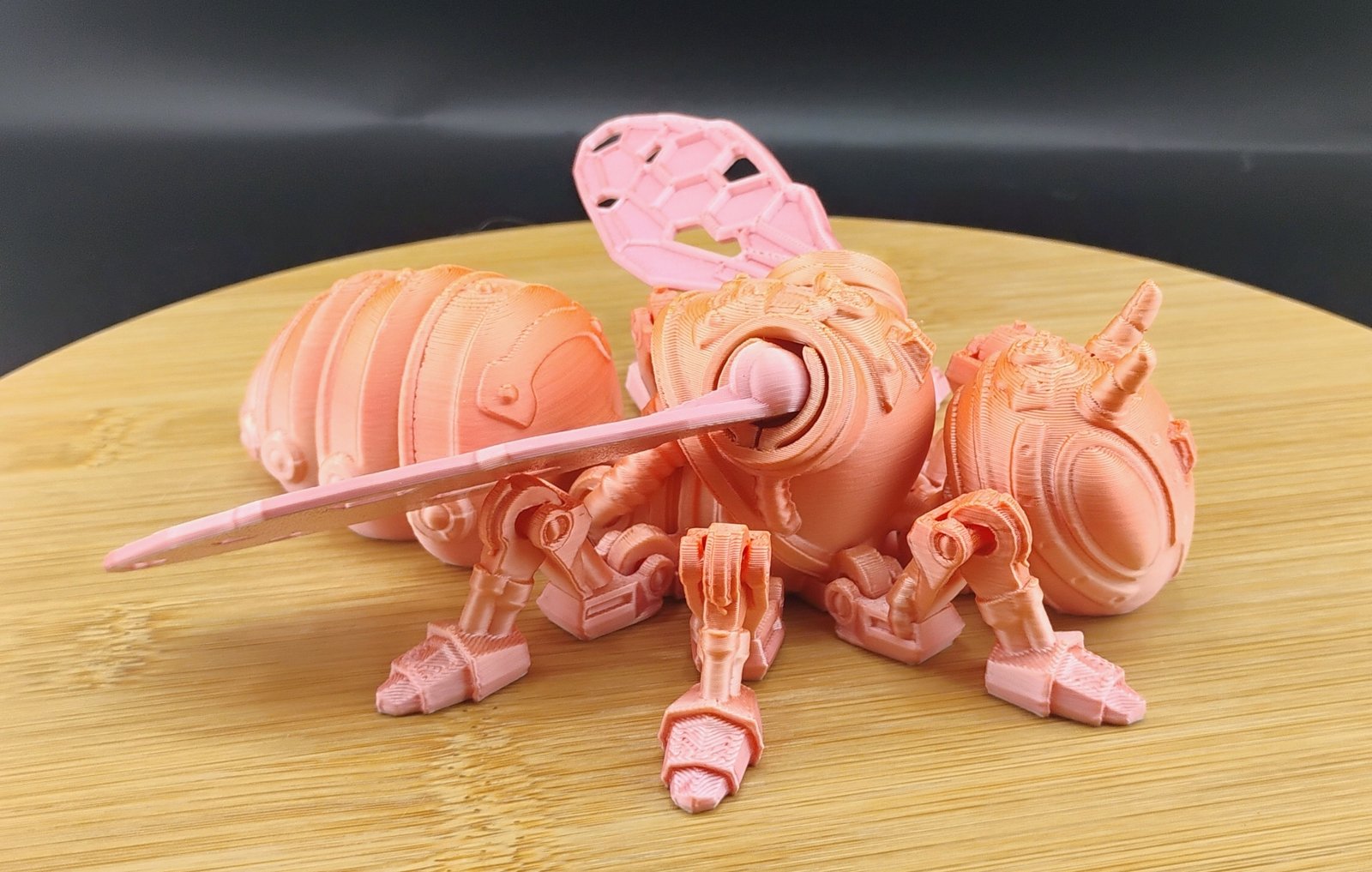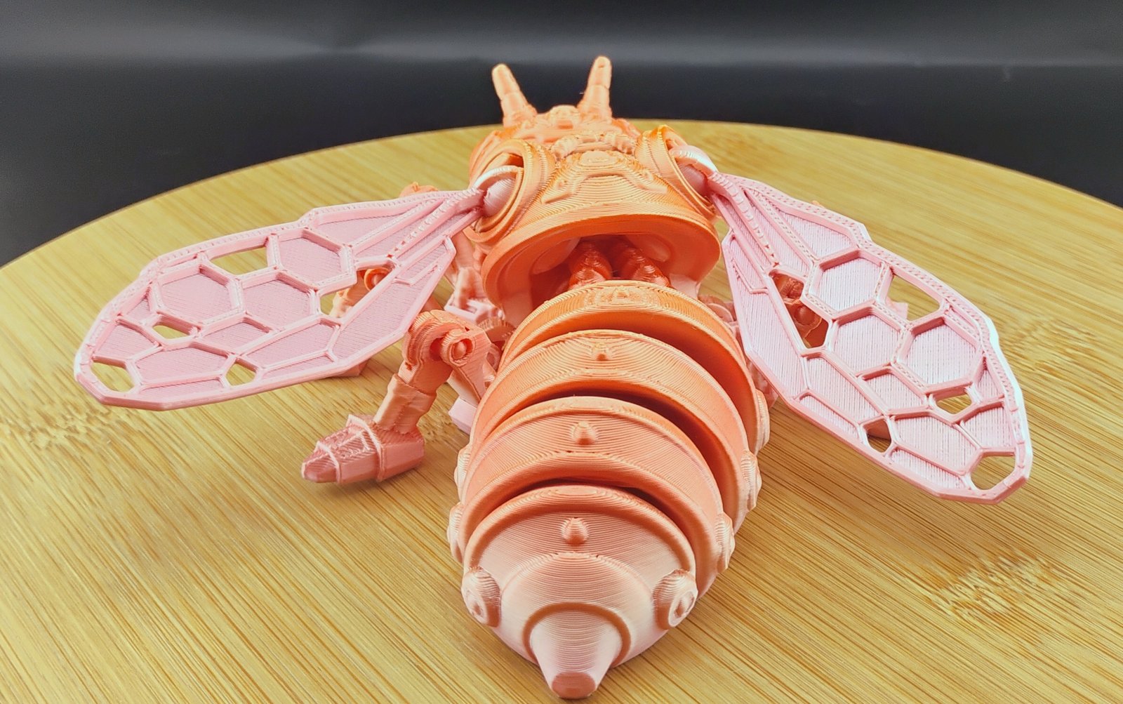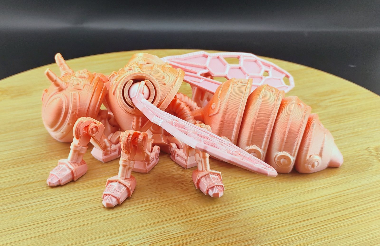 Printed in vibrant pastel gradients with soft peach, coral, and cotton-candy tones, this fully articulated Flexi Factory Cyber Bee blends adorable charm with futuristic cyber-tech vibes.