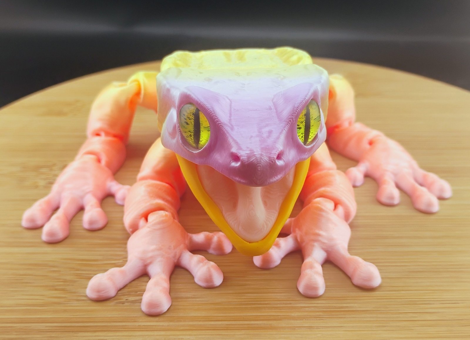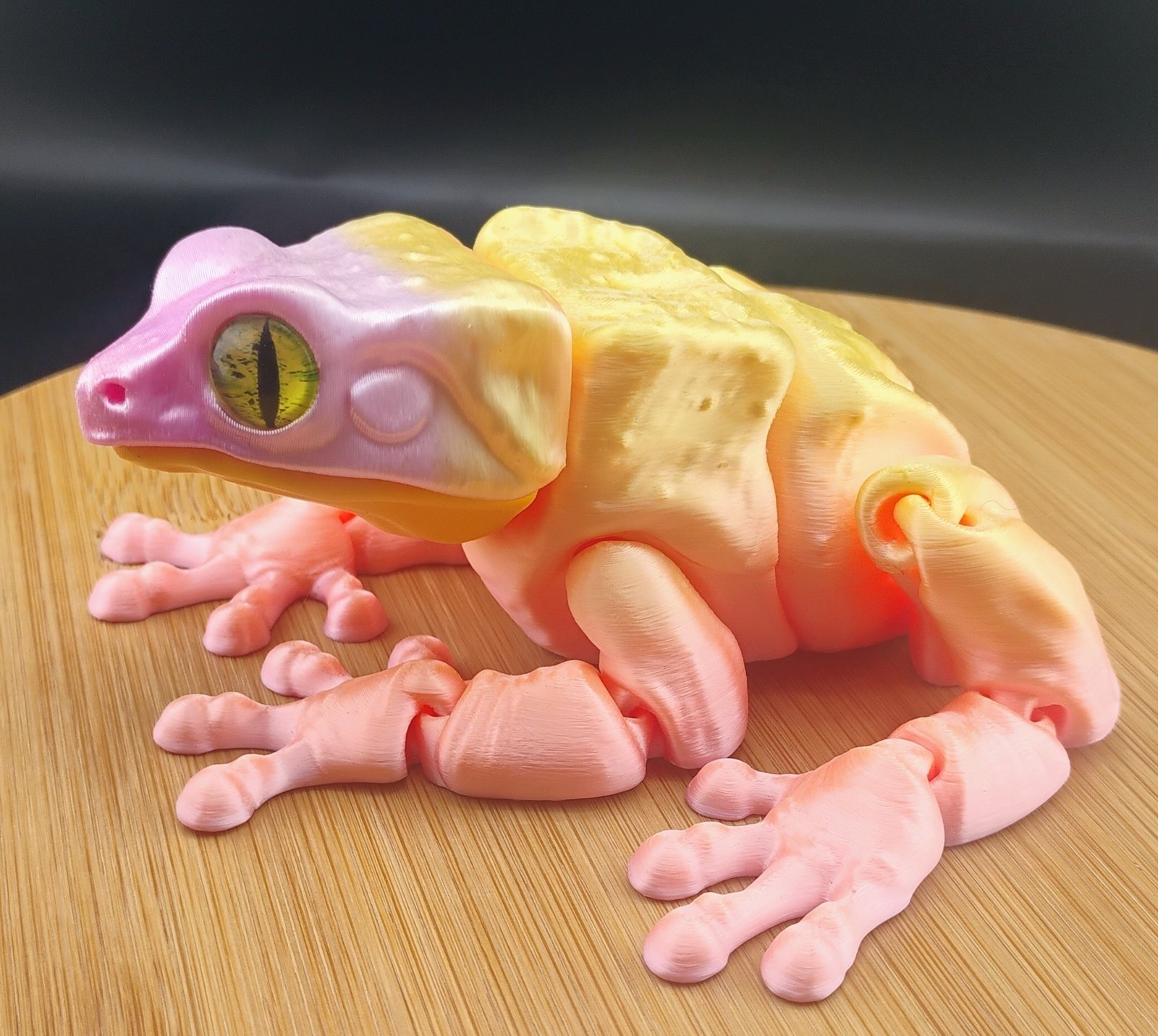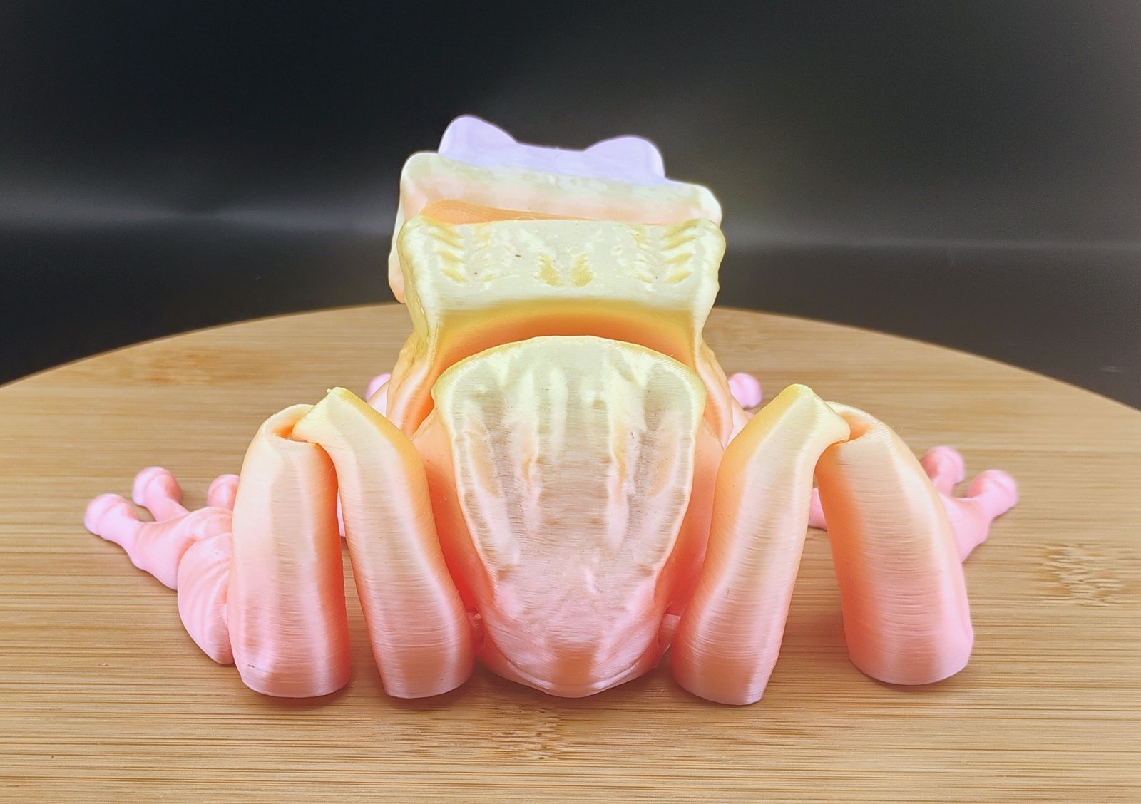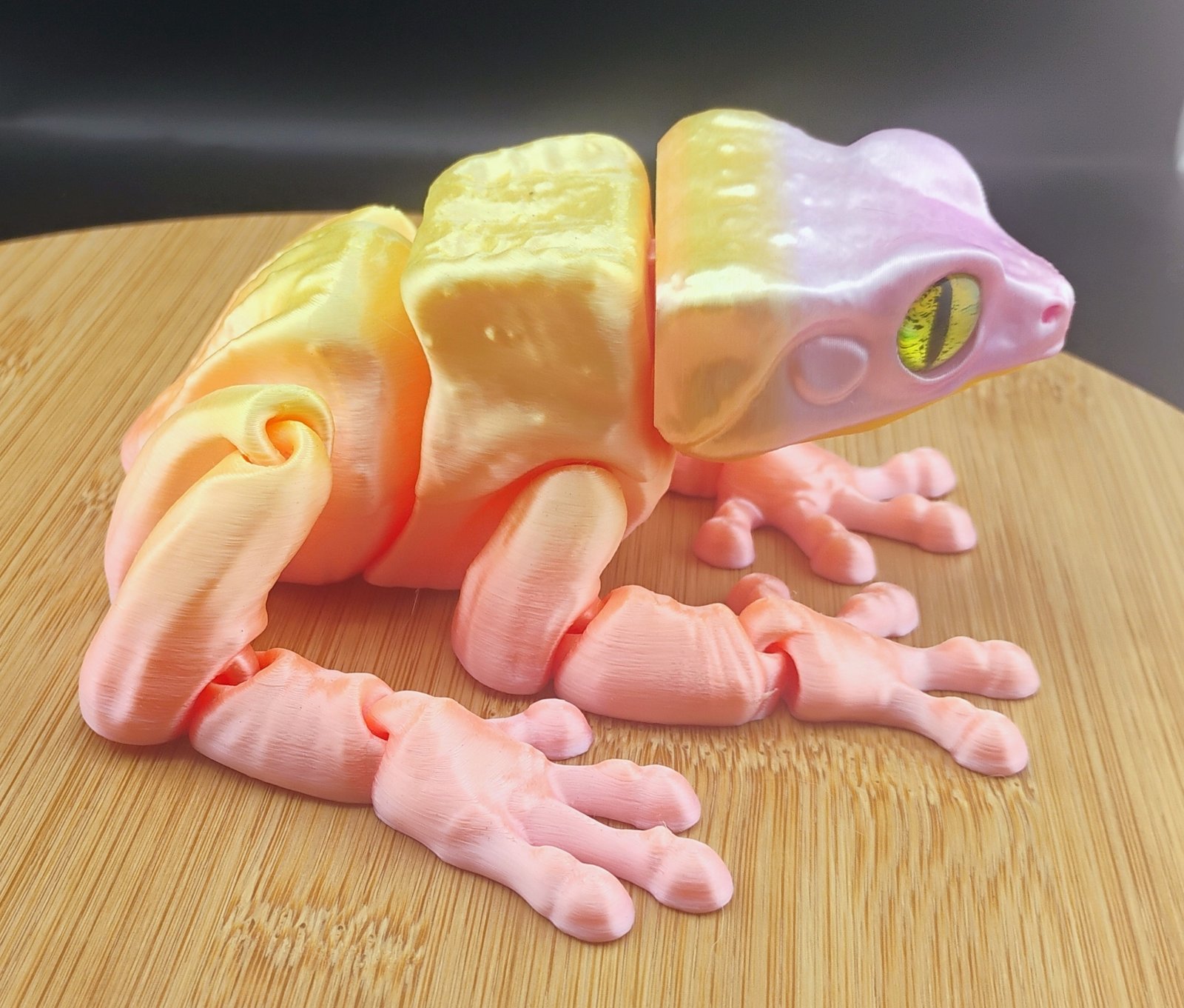 Bring a burst of sunrise warmth to your desk or display with the Sunburst Frog, a charming articulated 3D printed amphibian glowing with the soft tones of a tropical morning sky. With its blend of peaches, pinks, pale yellows, and creamy highlights, this pastel dream looks like it hopped straight out of a sunlit paradise.