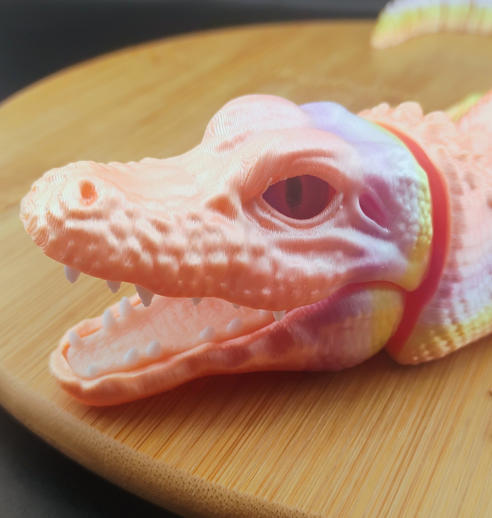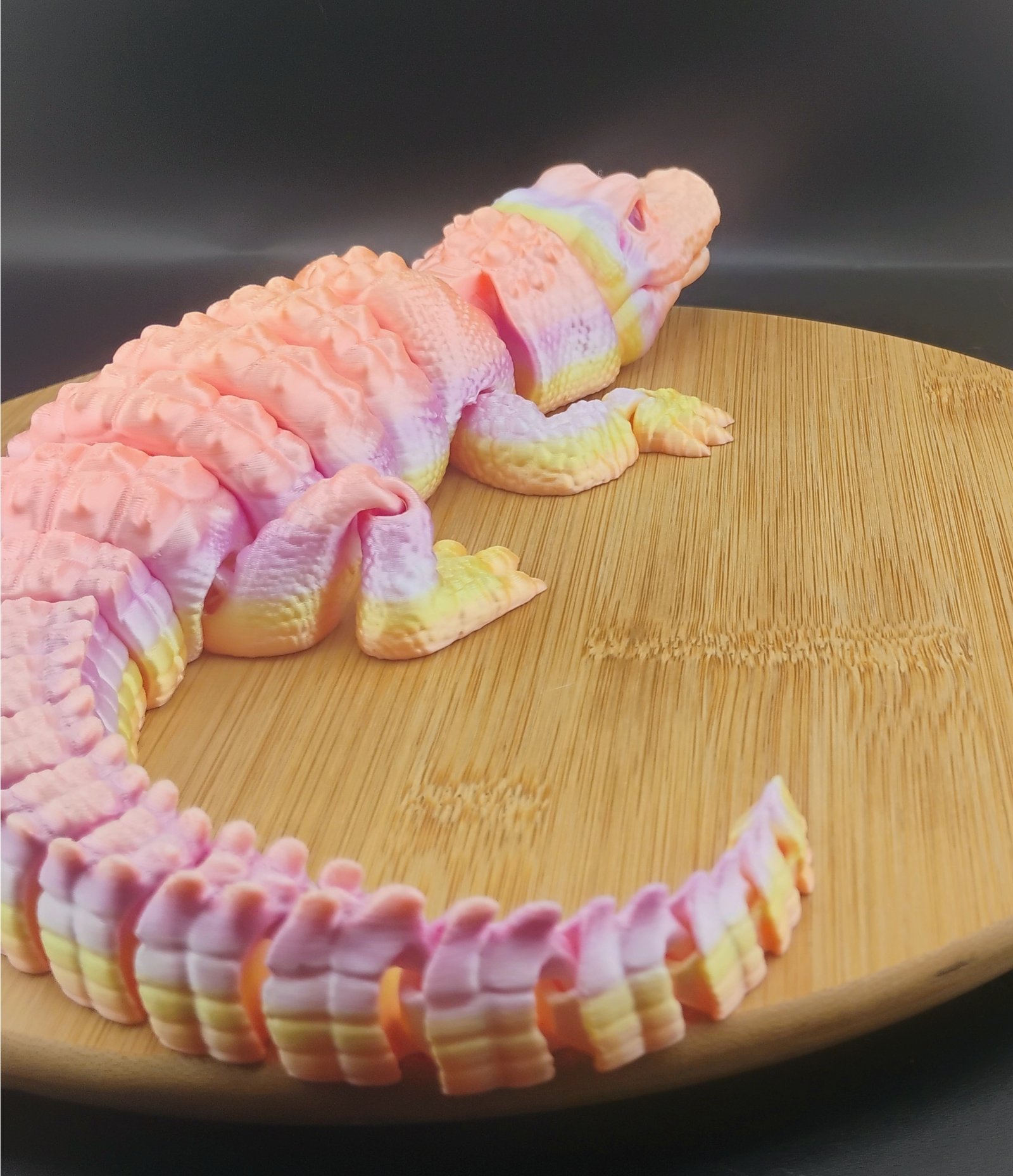 Meet the Duskscale Flexigator, a 16-inch articulated 3D printed gator featuring warm sunset-inspired colors. Built with 3 perimeter walls for enhanced durability and 15% gyroid infill for smooth, flexible motion. Perfect as a desk pet, fidget toy, or collectible articulated creature for fans of unique 3D prints and gradient filament designs.