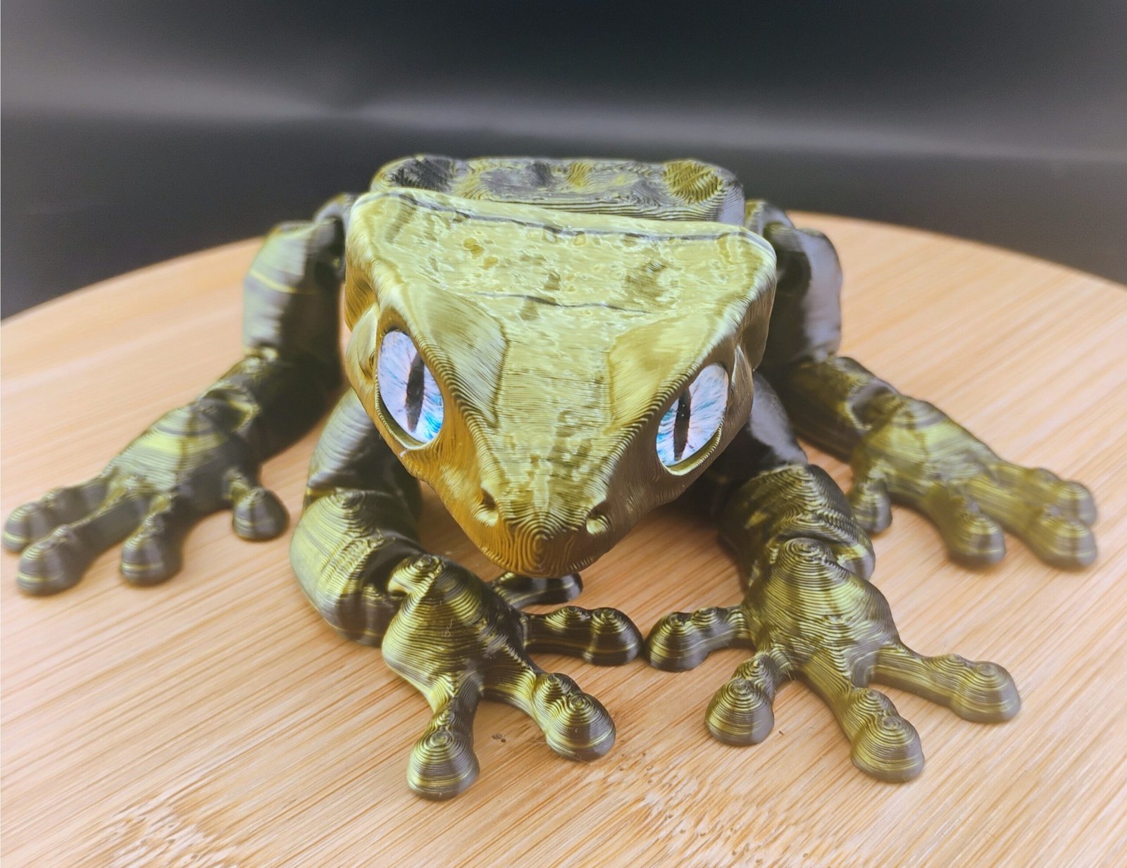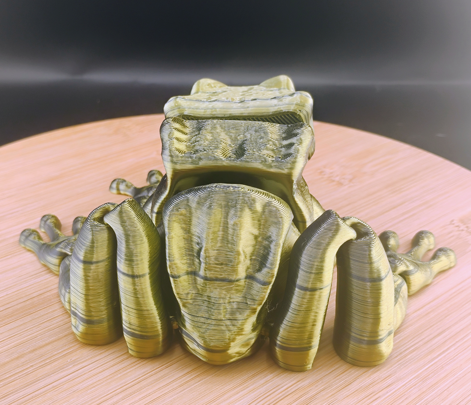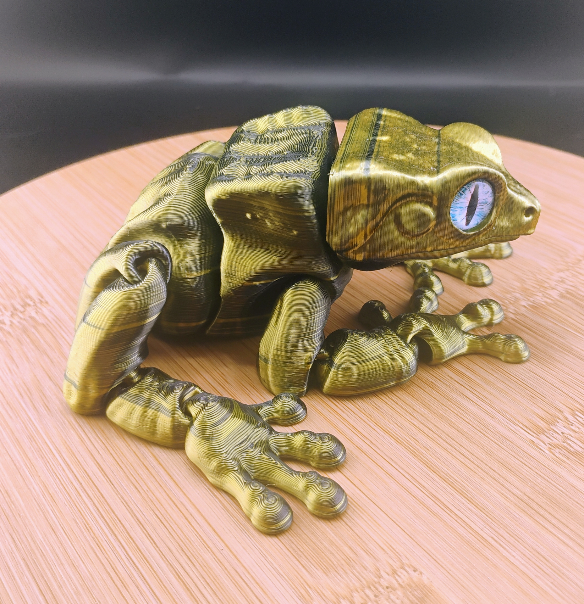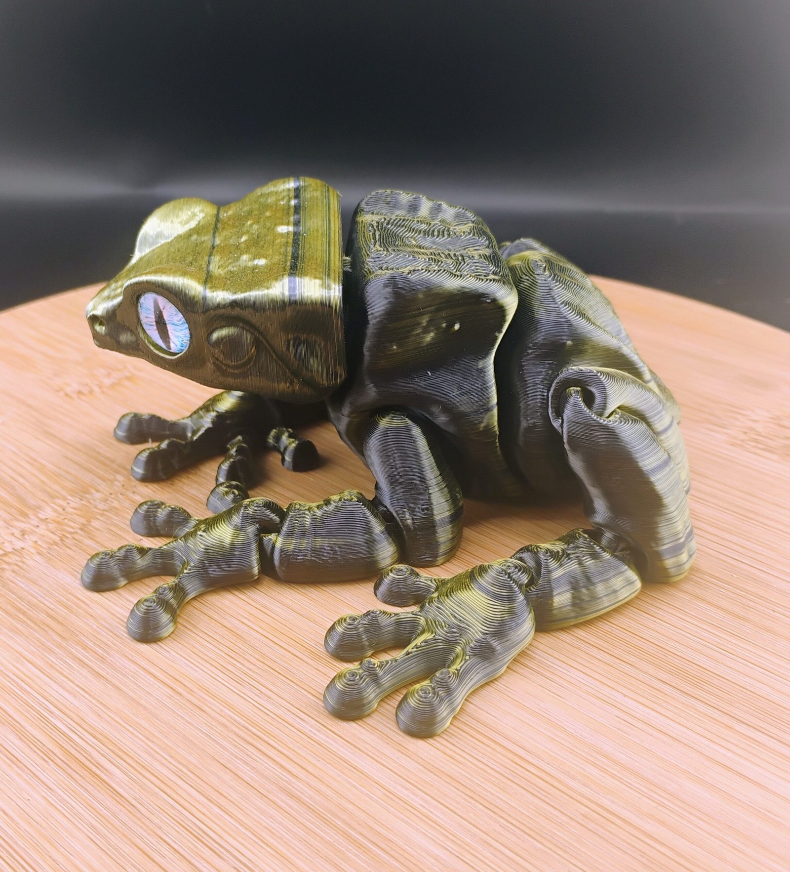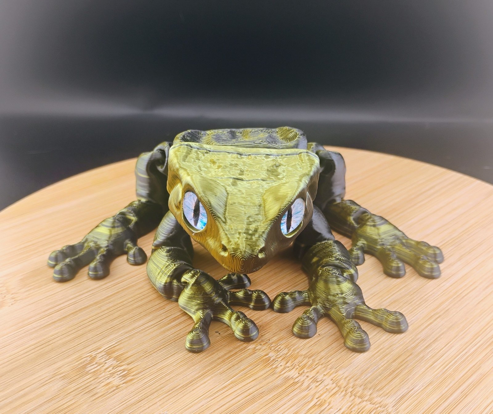 Each Venomleaf Frog is crafted using filament with natural marbling and color flow. This means every piece will feature unique blends of gold, olive, black, and moss-like swirls.