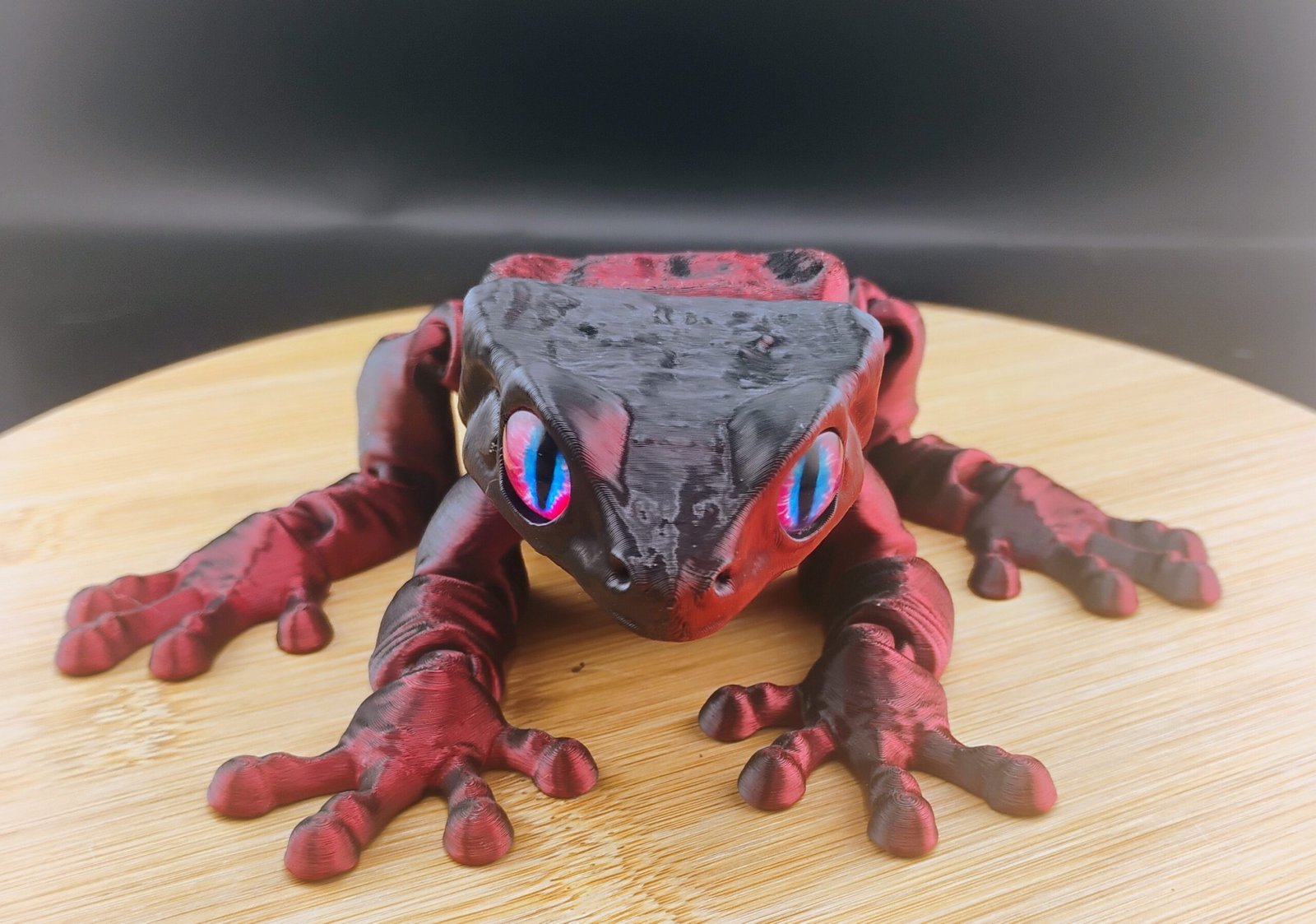 Summon the darkness with the Voidflare Frog, a fearsome articulated 3D printed amphibian forged from swirling shadows and ember-red highlights. With its obsidian body, metallic crimson gradients, and piercing neon eyes, this creature looks like it slipped through a cosmic rift just to lurk on your shelf with supernatural swagger.