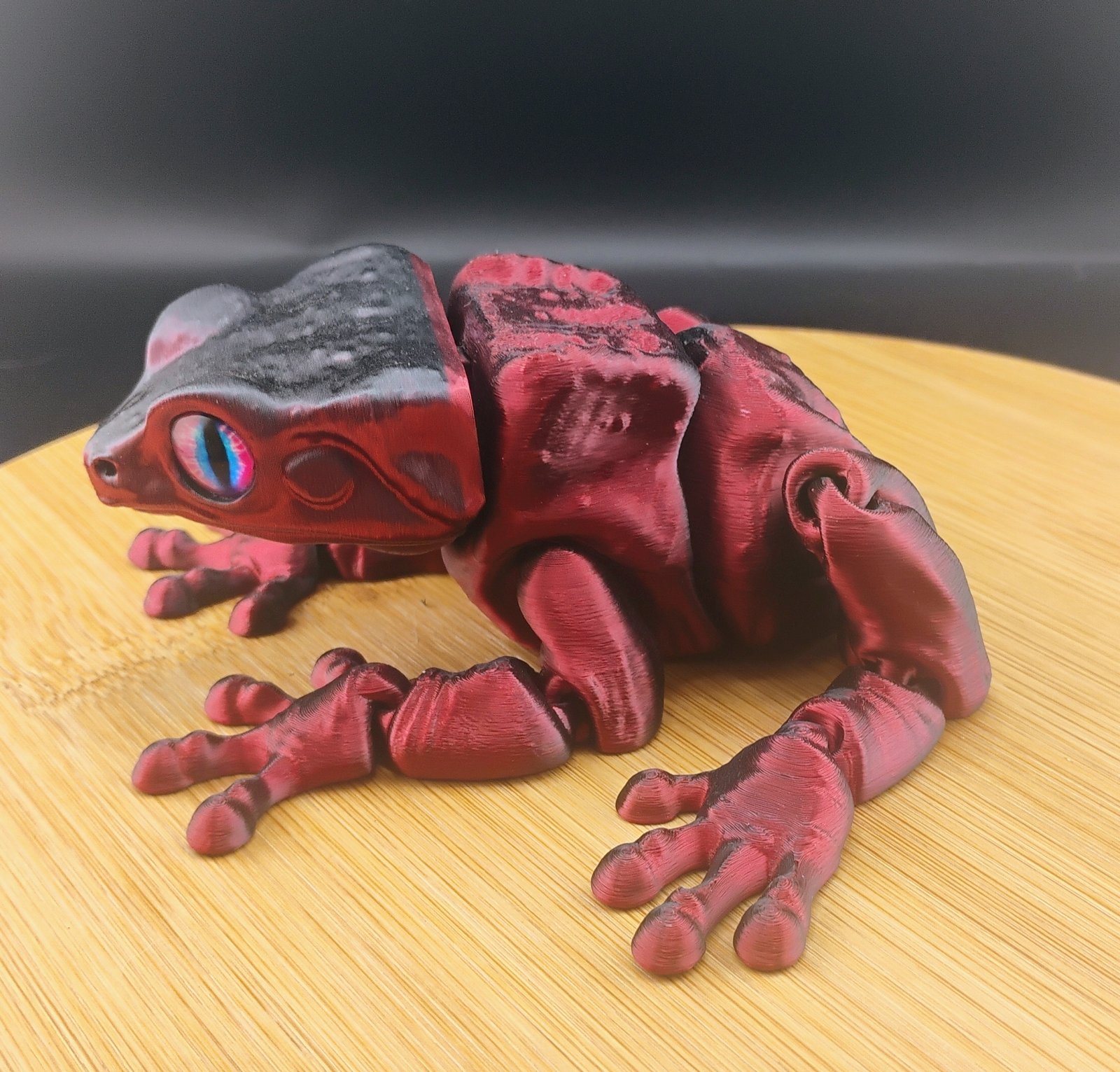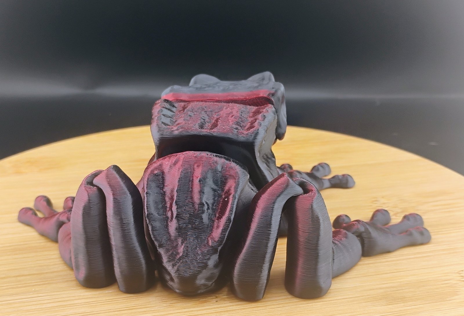 Each Voidflare Frog is printed using filament with natural color variation, resulting in a unique arrangement of black, red, and shadowy gradients.