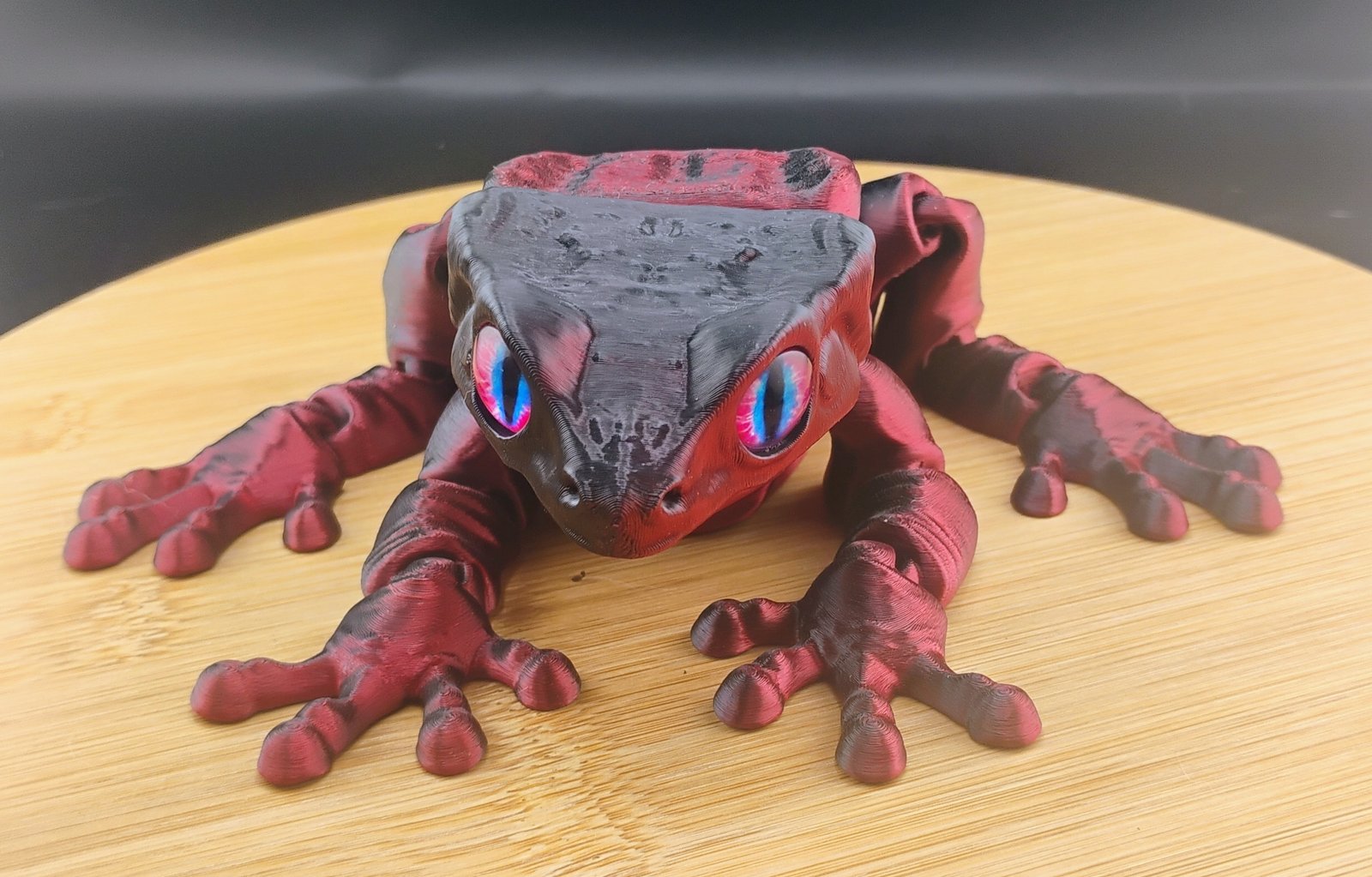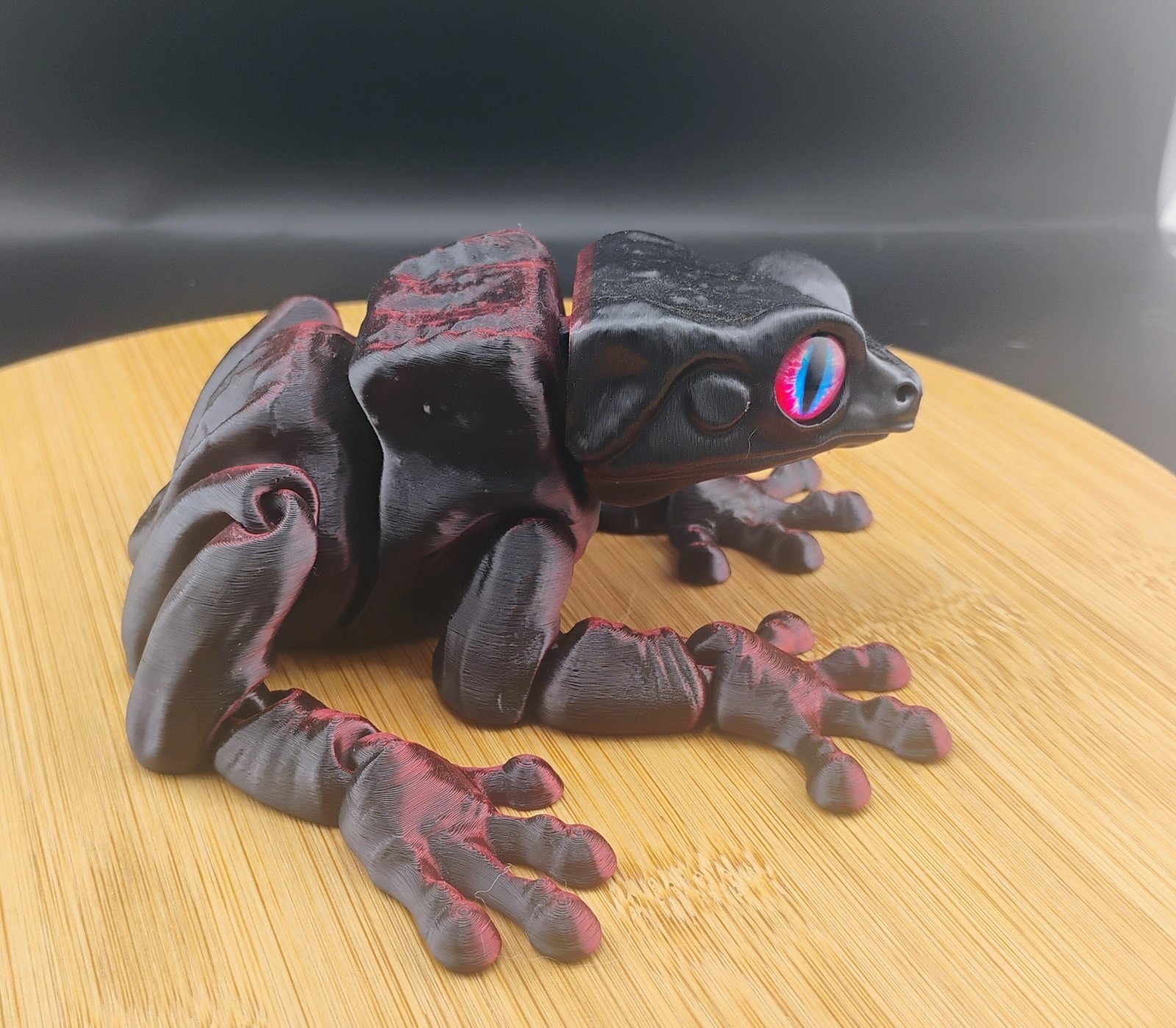 The Voidflare Frog is a striking articulated 3D printed frog featuring deep shadow-black tones with intense red highlights and vibrant electric eyes. Printed with 3 perimeter walls and 15% gyroid infill for strength and smooth, flexible posing.